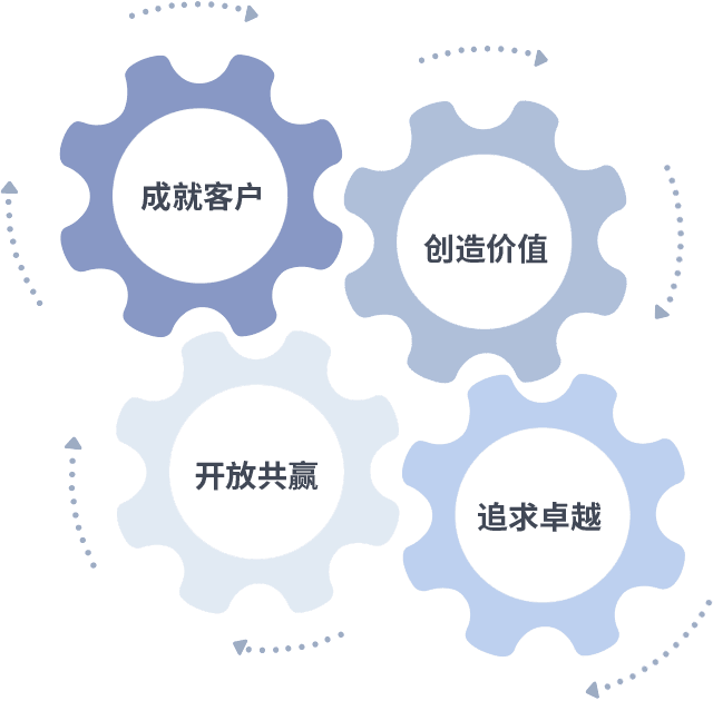 成就客户是一切决策的出发点,,,,创造价值是衡量所有工作的标准,,,追求卓越是我们做事做人的态度,,开放共赢是我们的格局也是最终的结果。。。价值观的齿轮环环相扣,,,推动着组织里的每个人不断向前。。。