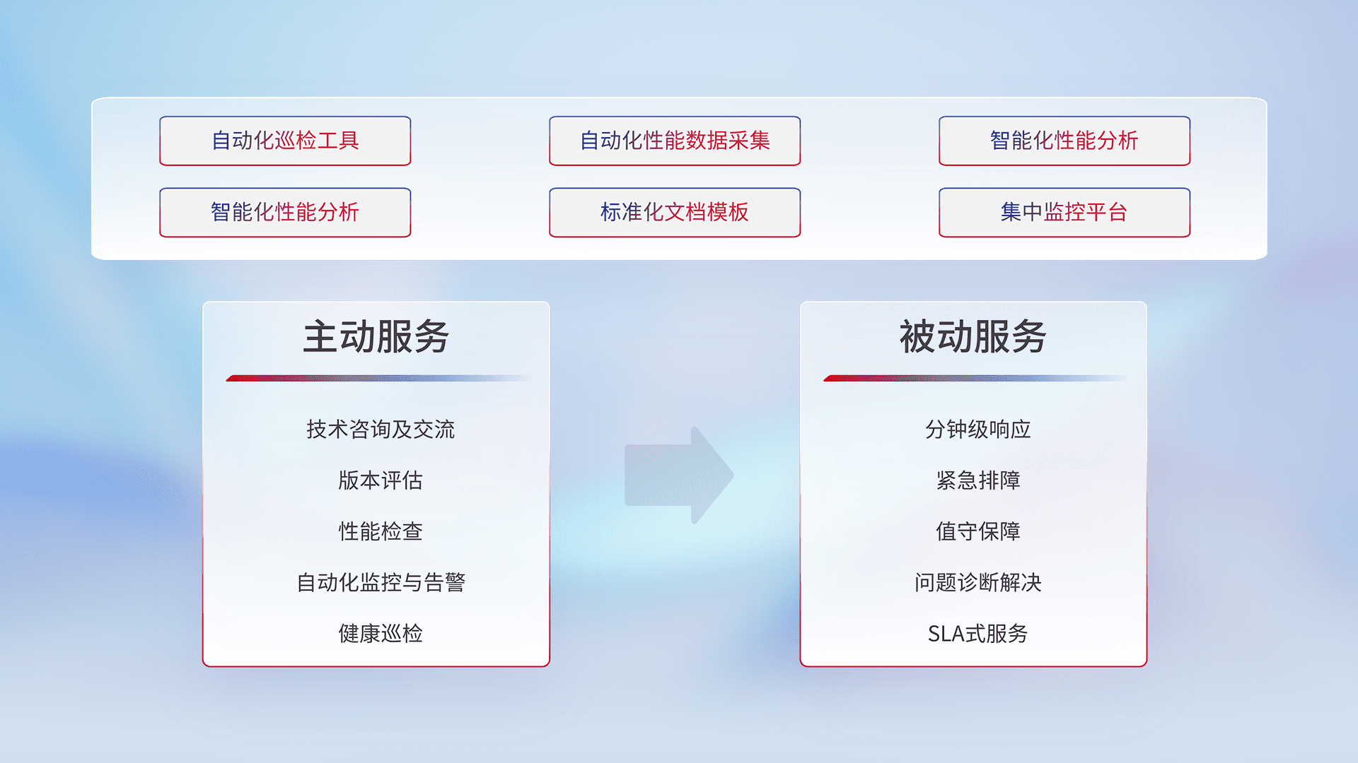 智能化工具和标准化文档,,,,保障服务质量,,提供主动服务(包含技术咨询、、版本评估、、性能检查、、自动化监控与告警、、健康巡检)和被动服务包含(分钟级响应、、紧急排障、、、值守保障、、、问题诊断解决、、SLA服务)。。。